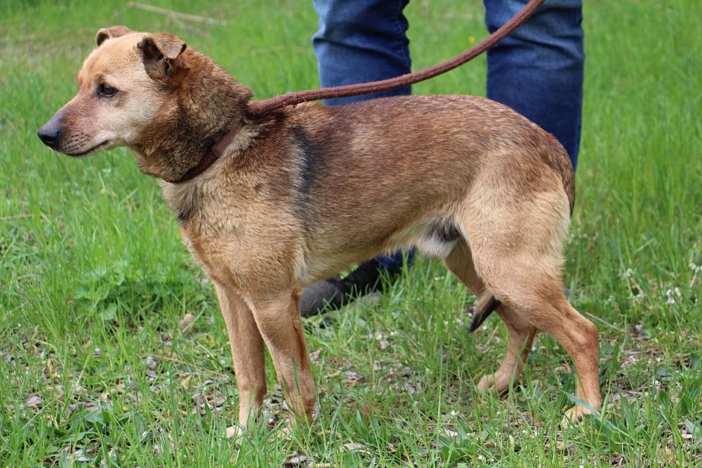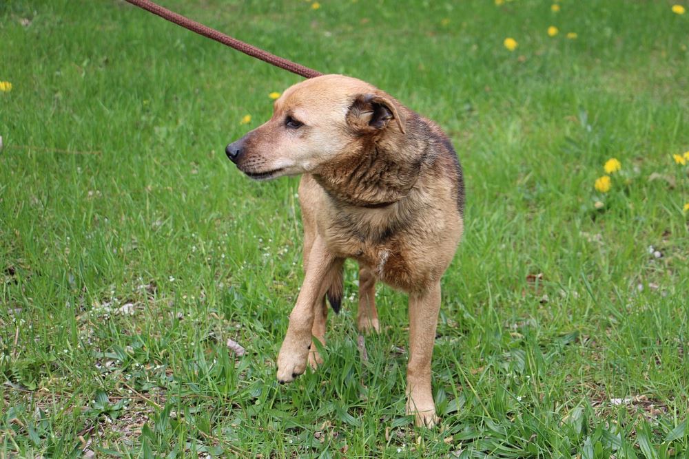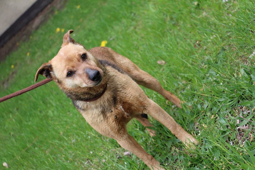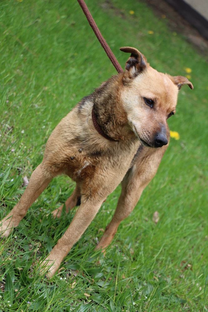 Pies przywieziony 5 maja 2021r, z gminy Rogoźno ze Słomowa. Psiak od dłuższego czasu koczował w lesie. Cały w kleszczach, jest drobny ok 11 kg miał wówczas ok. 6 lat