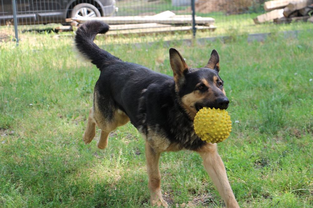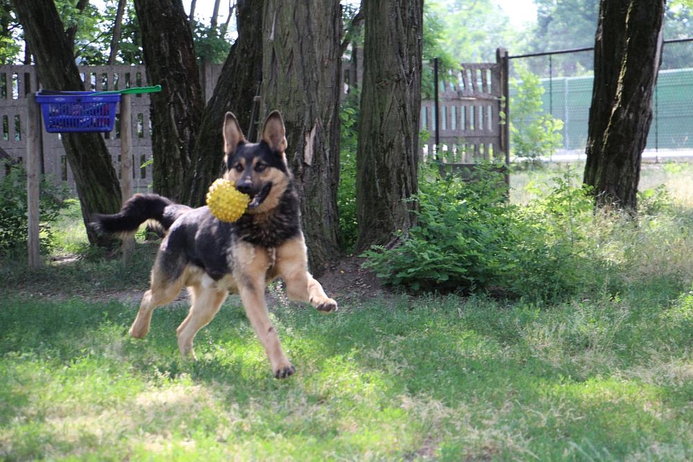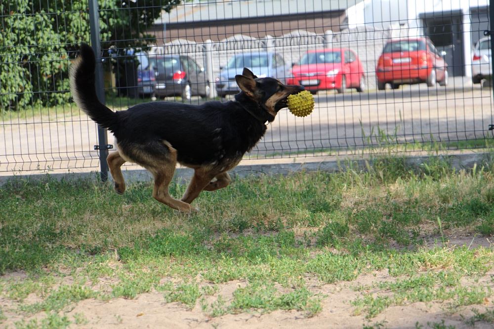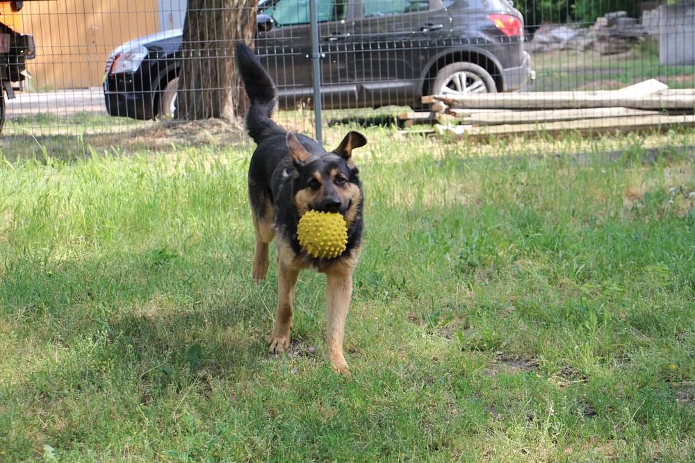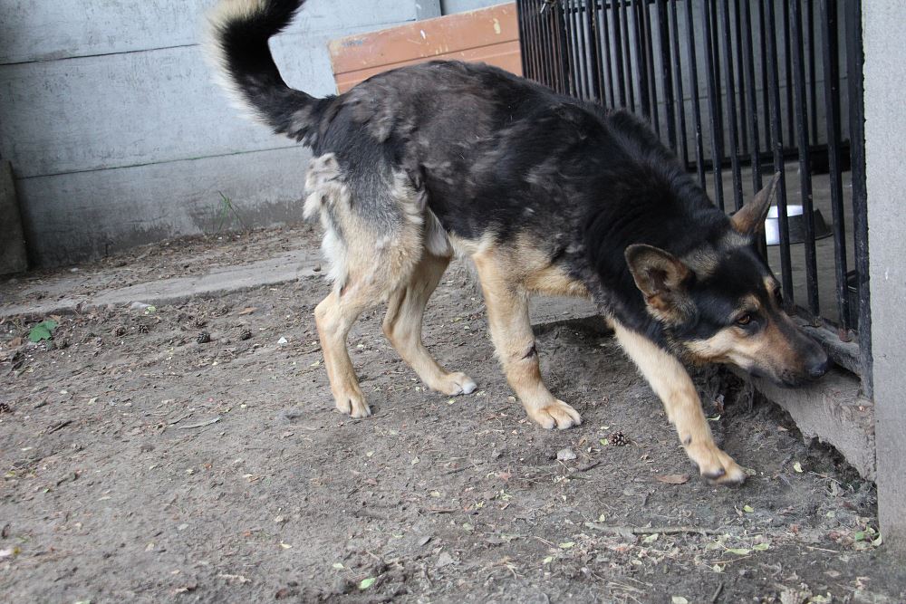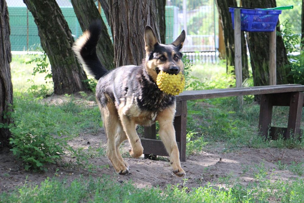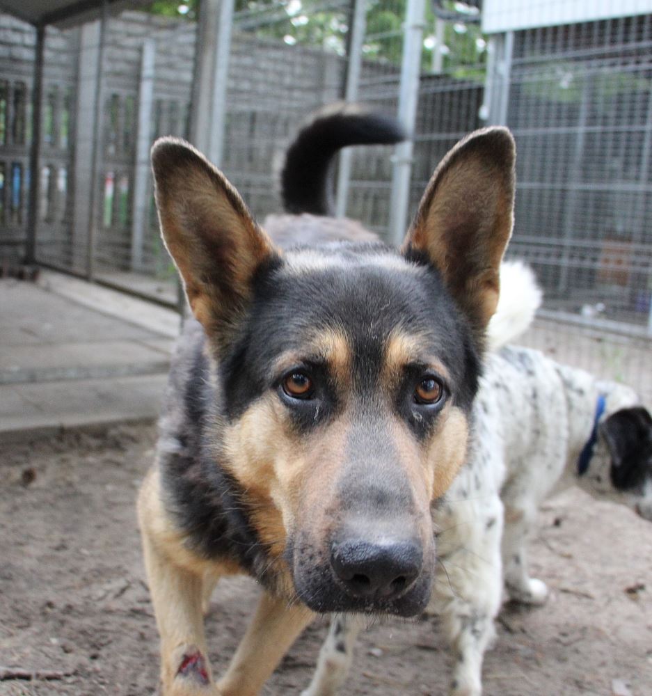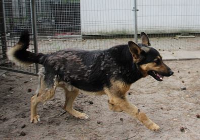 Pies przywieziony 18 maja 2021 r. z gminy Murowana Goślina. Bond przyjechał z suczką Szelką. Psy zostawił na posesji właściciel i zniknął. Bond przyjechał do nas z raną na łapie. Bond wzbudza respekt. Jest młodym psem, ma ok. 3-4 lat. Pies ma fiksację na punkcie strumienia wody z węża. kłapie pyskiem lecącą wodę. Dowcipniś potrafi zabrać wąż i biegać z nim w koło.