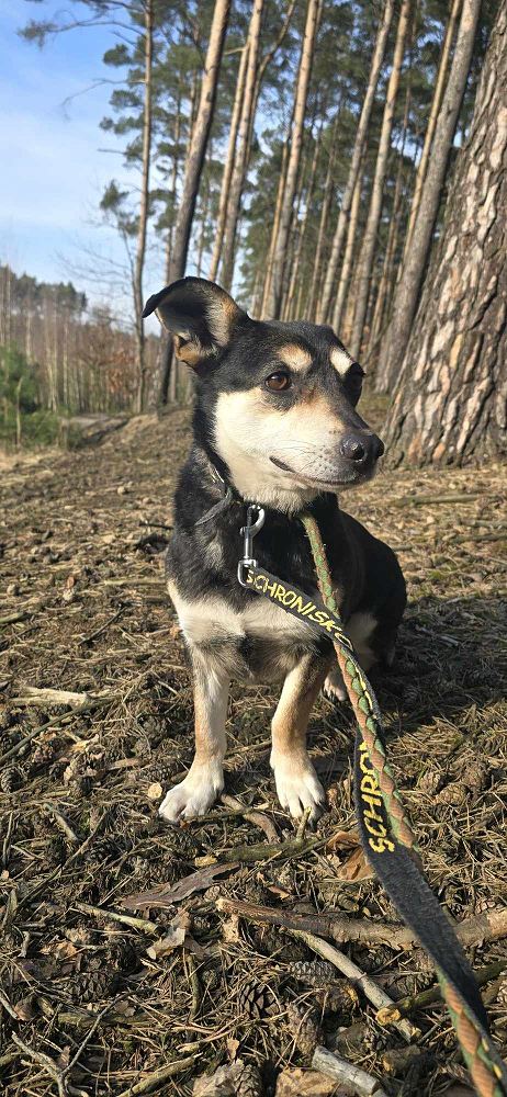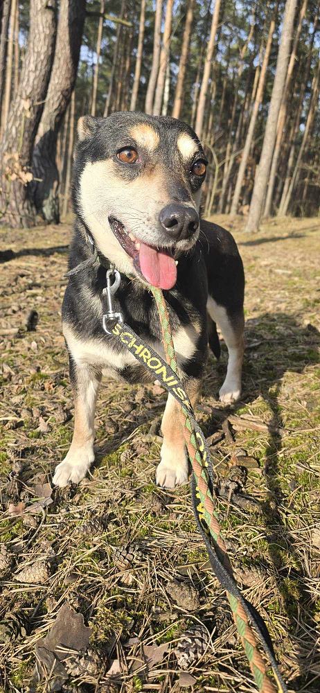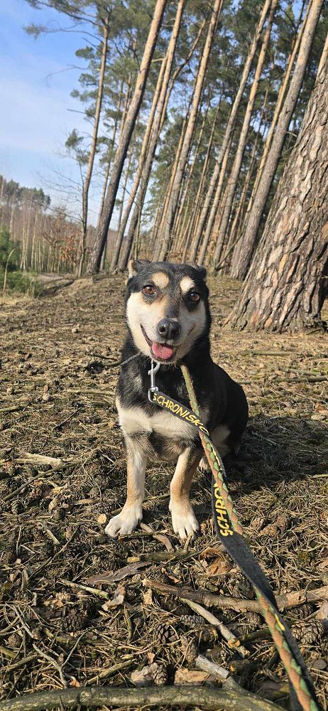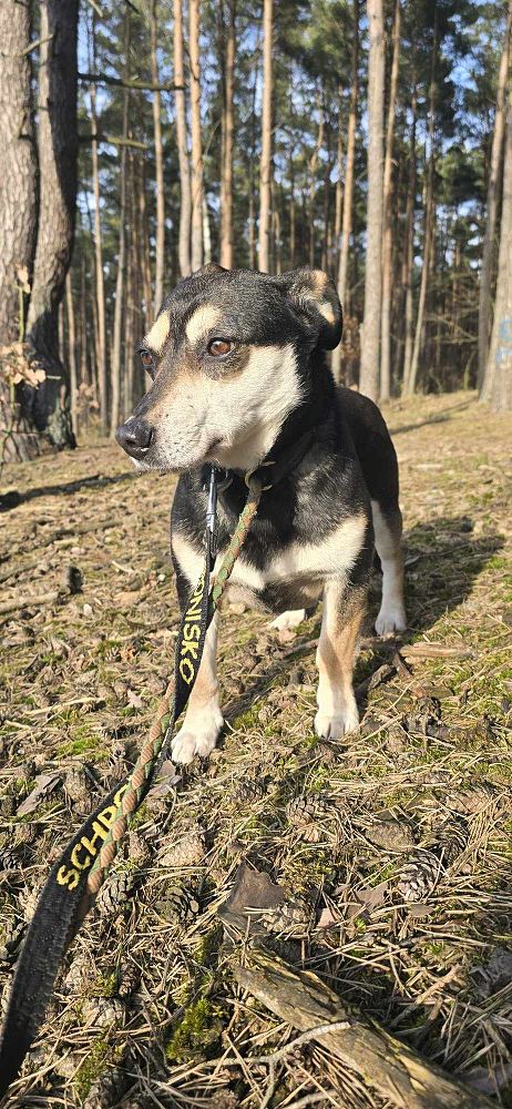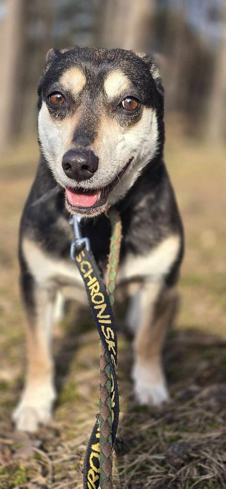 Suczka odłowiona 10 czerwca 2021 r. w Kiszewie gmina Oborniki. W stogu słomy miała 7 młodych około 2 tygodniowych. Była psem nie znającym smyczy, człowieka, dotyku.... Praca ludzi jednak daje rezultaty- daje się podpiąć pod smycz, chodzi chętnie na spacery- poznaje dotyk człowieka- postępy oczywiście były by szybsze w domu... Oceniona została na skończone 2 lata.