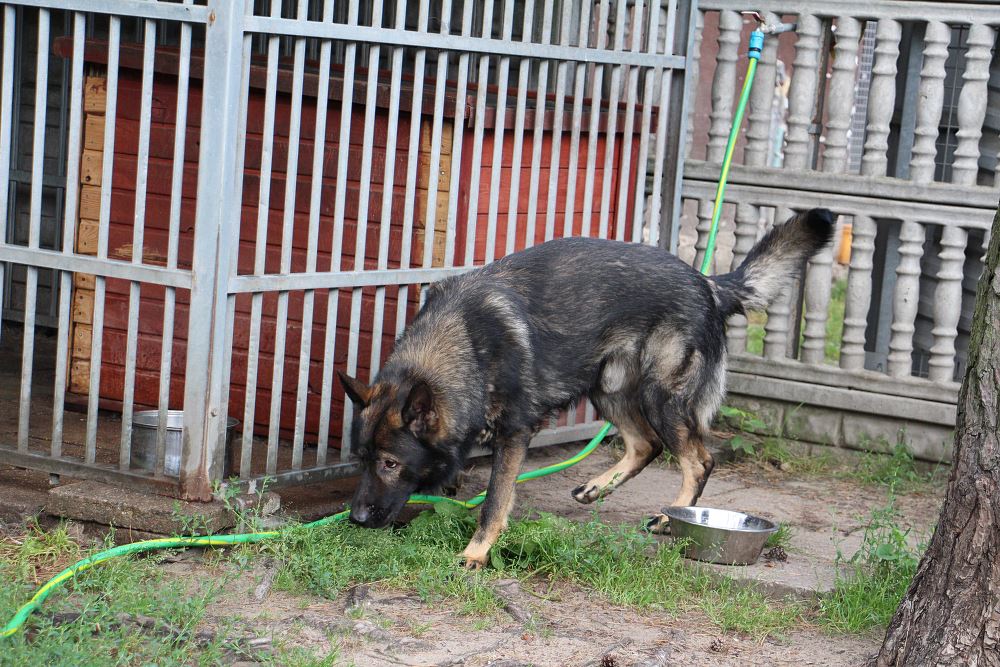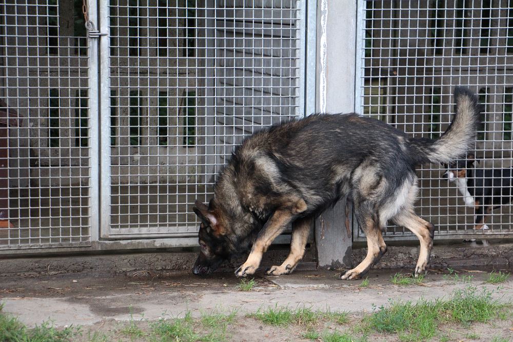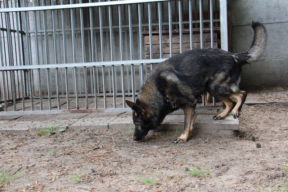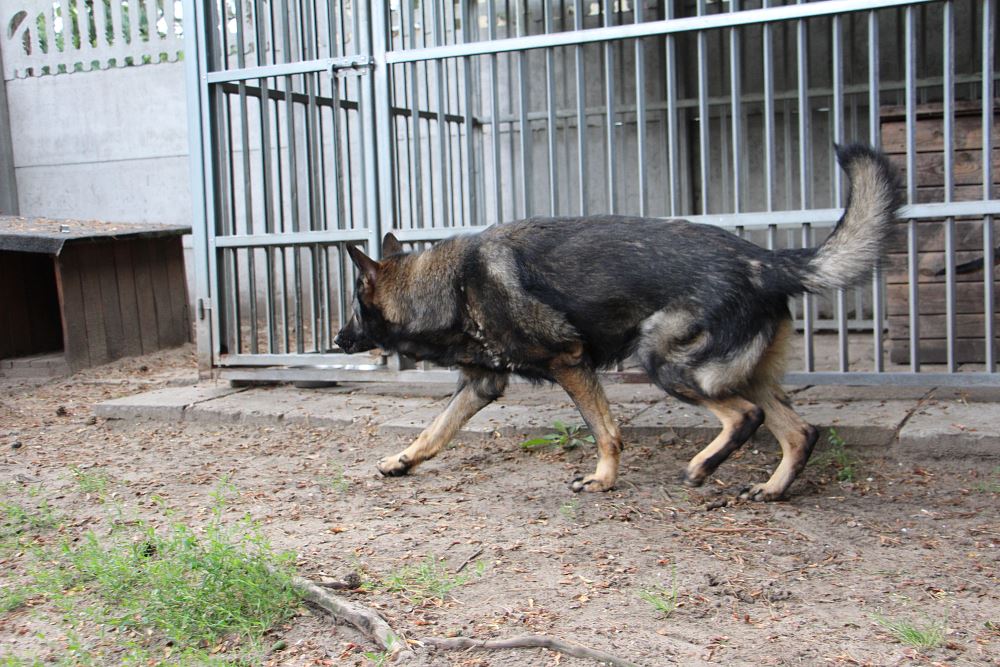 Pies przywieziony 18 lipca 2021 r. rano z Rogoźna. Był przywiązany łańcuchem do drzewa przy ulicy W. Polskiego. Bary przestraszony sytuacją, warczy na nas. Z czasem pewnie się oswoi. Cieszy go widok piłki, ale nie łapie jej. Bary bardzo oszczekuje obcych. Ma ok. 3-4 lat. Bary potrafi chodzić na smyczy. Na polecenie wchodzi do kojca.