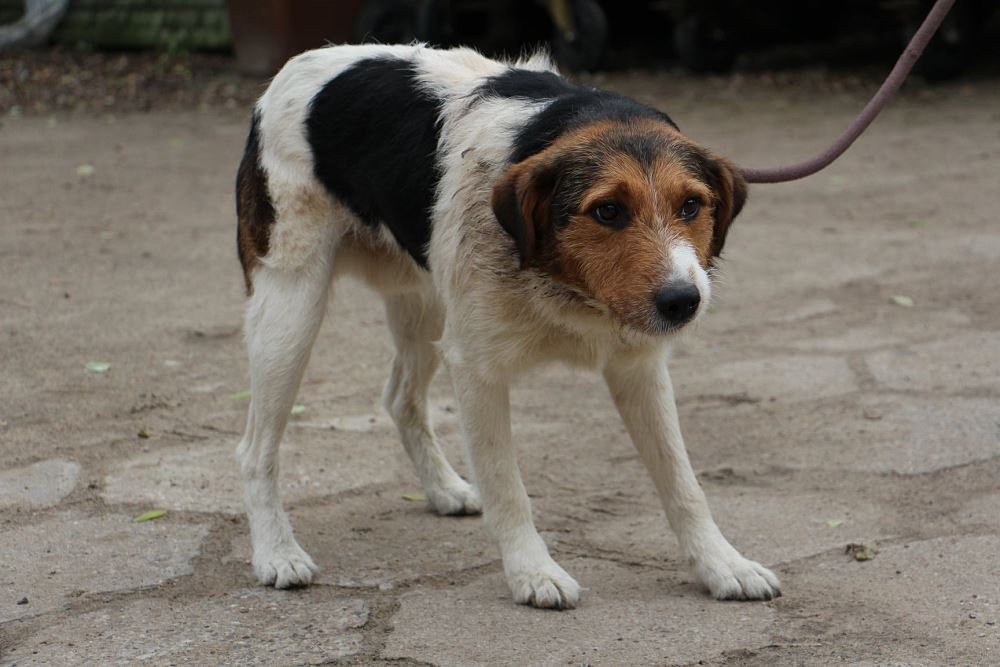 Pies przywieziony 18 października 2021 r. z gminy Tarnowo Podgórne z drogi na Jankowice. Lager przyjechał ze swoją siostrą Chałką. Rodzeństwo ma około 3-4 lat.