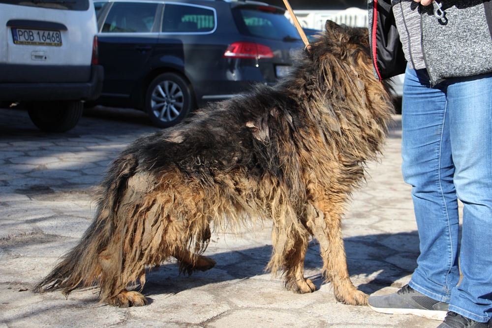 Pies odebrany interwencyjnie 18 lutego 2022 r. w gminie Oborniki. Pies ma 4 lata, wyglądu nie trzeba opisywać. A na zapach nie ma słów. Jest łagodny. Jak tylko trochę uspokoi się i zaufa pracownikom zajmiemy się jego okrywą włosową