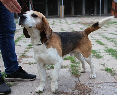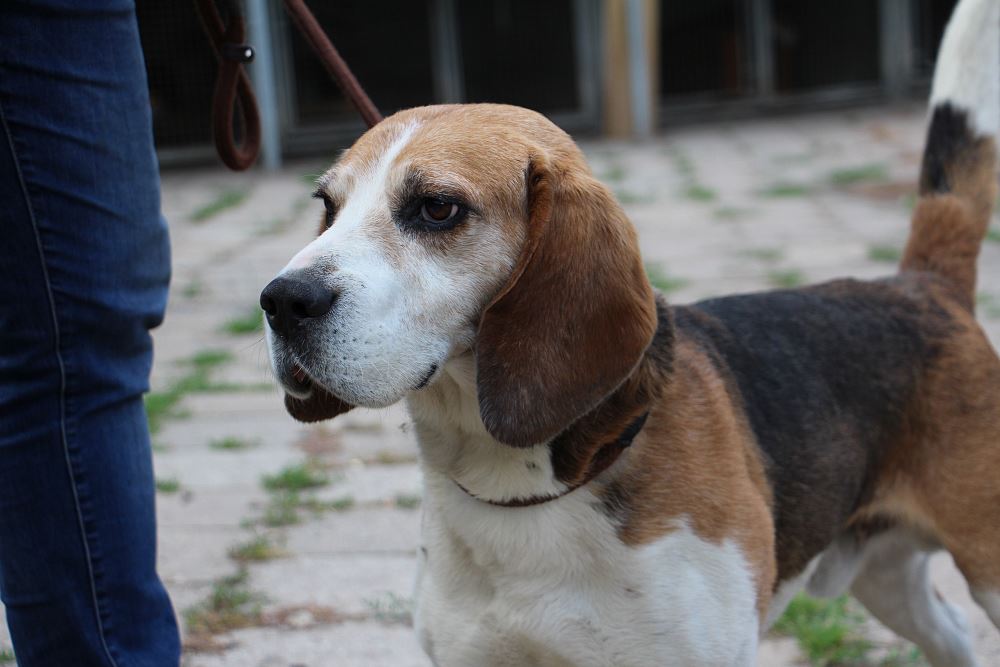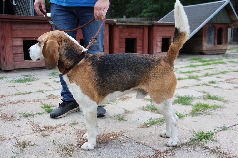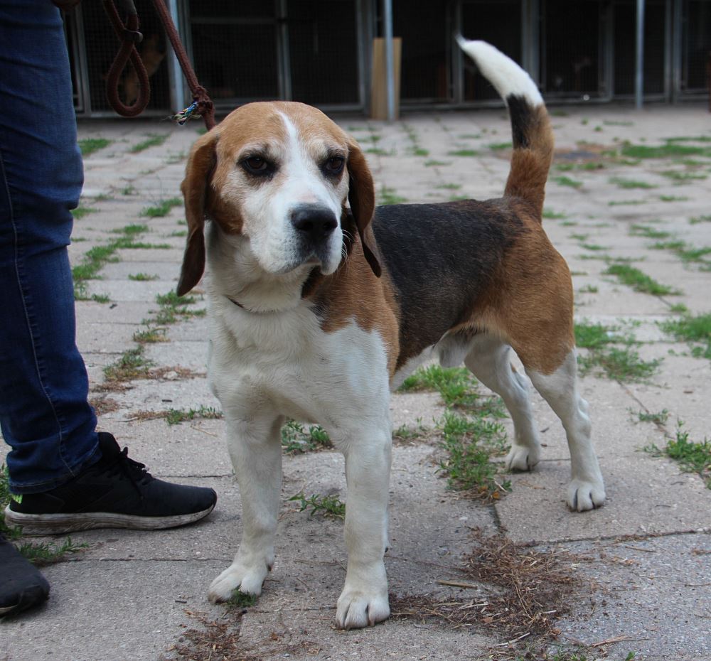 Pies przywieziony 12 czerwca 2022 r. z Boruchowa gmina Ryczywół. Od dłuższego czasu stołował się w jednym z gospodarstw, ale nie dał się złapać. Poskutkowała dopiero klatka łapka. Szrek ma ok. 7 lat. Jest duży, masywny, wygląda jak wyrośnięty beagle. Miał mnóstwo kleszczy. Potrafi chodzić na smyczy, nie wykazuje agresji do ludzi.