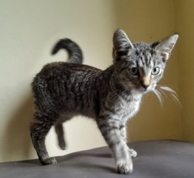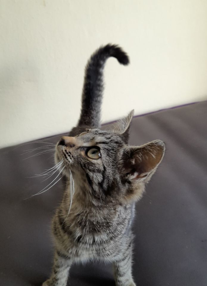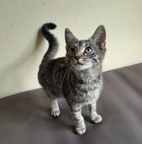 Kotka przywieziona z Podlesia 22 września 2022r. Weszła panu do samochodu. Ma około 10 tygodni.