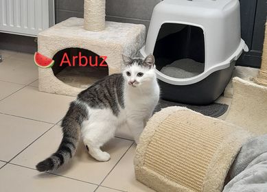Arbuz obecnie nasz rodzynek w pomieszczeniu, trochę leniwy kocurek, godzinami potrafi wylegiwać się na miękkim kocu. Uwielbia głaskanie człowieka, chętny do zabaw. Kocur trafił do schroniska 17 listopada 2022 r. Ma ok. 5 miesięcy. Czeka na dom. Kontakt w sprawie adopcji 605 922 630