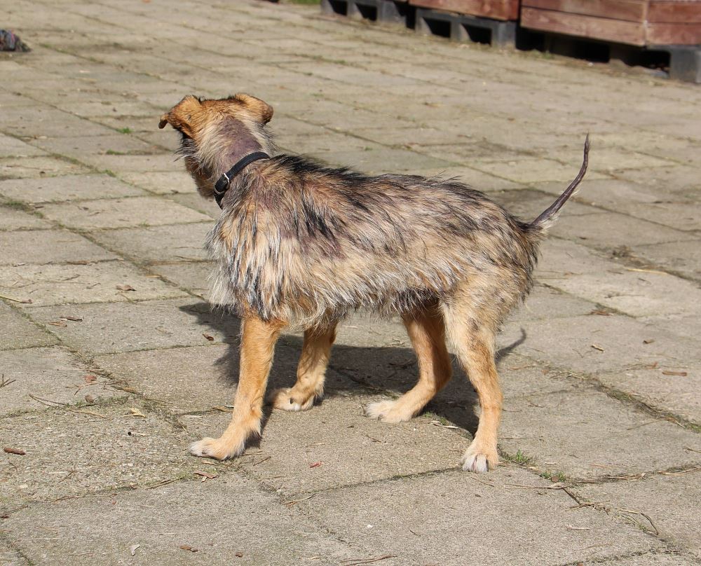 Pies przywieziony 1 marca 2023 r. z Murowanej Gośliny. Ma ok. 12 lat. Ma silną alergię na pchły. Jest grzeczny wobec ludzi.