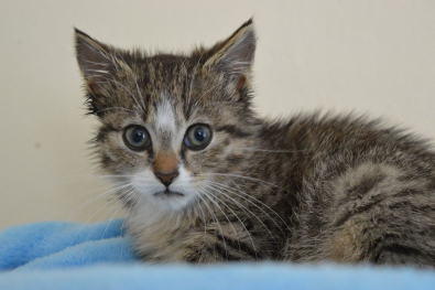 Młoda koteczka szara, z białymi znaczeniami jest niepewna. Przerażona widać po oczach, stopniowo przyzywczaja się do nowej sytuacja która ją spotkała. Na dniach będzie szczepiona.