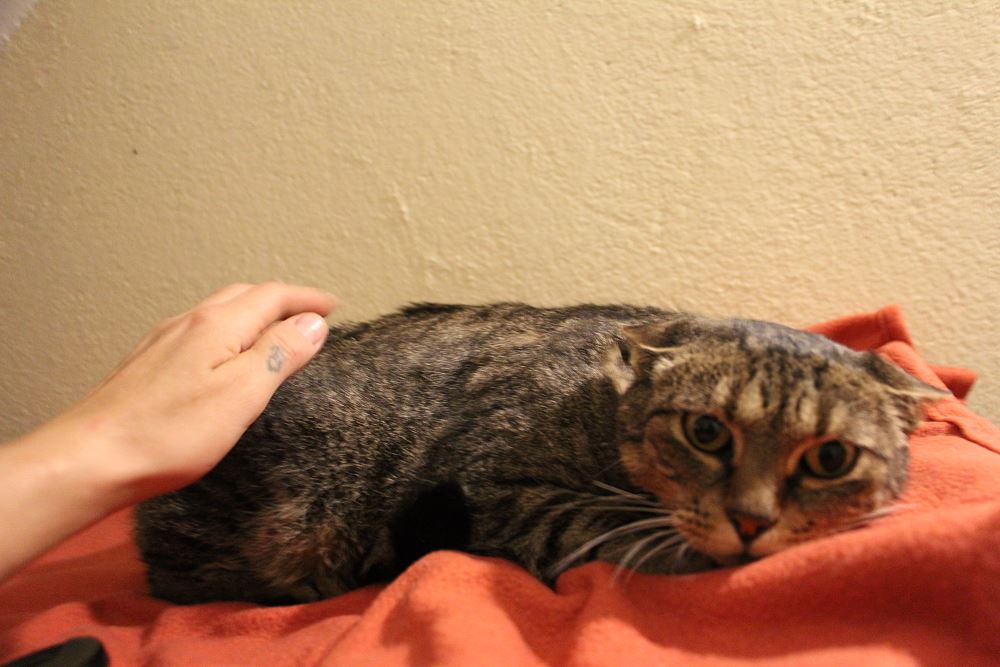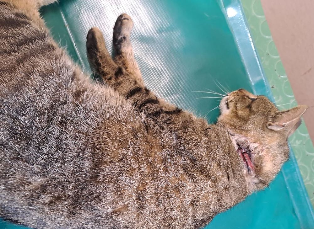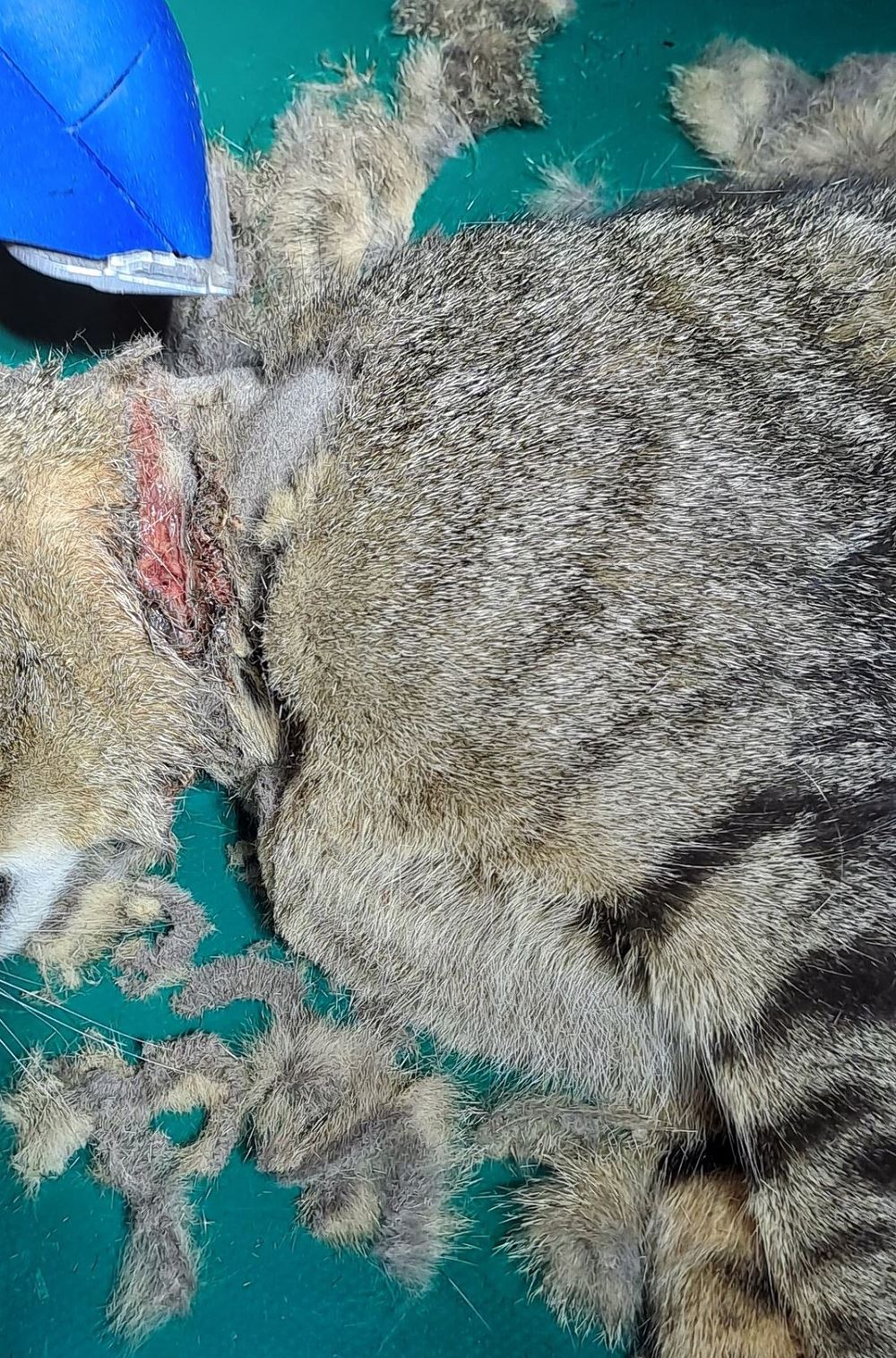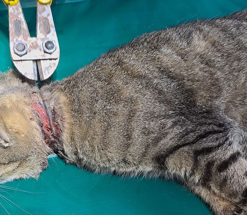 Uwaga zdjęcia są dość drastyczne, kolejny oto kot na pokładzie, niestety historia bardzo smutna, mam nadzieję, że będzie happy endem. Lusia bo takie imię u nas dostała, to oswojona, pręgowana szara kotka, pochodzi z Popówka, była kotem bezdomnym dokarmiana przez karmicielką(możliwe że za kociaka miała dom, ale ją wyrzucono)Według lekarza zapewne ktoś specjalnie zamontował/poskręcał na jej szyi dość mocno ten drut… Nie było wcale łatwo go zdjąć, na szczęście się udało rana została oczyszczona. Obecnie kotka przebywa w lecznicy i dochodzi do siebie. Istnieje możliwość zabrania jej na dom tymczasowy, po wyzdrowieniu i komplecie badań adopcja. Więcej informacji 605 922 630 (w godzinach otwarcia schroniska)