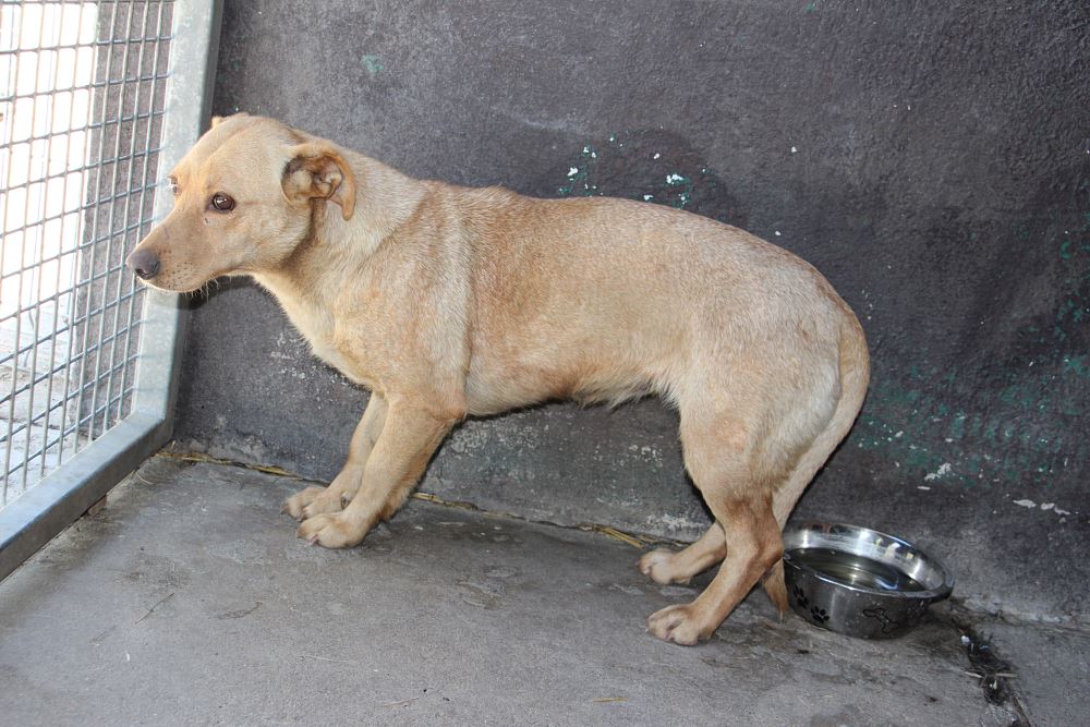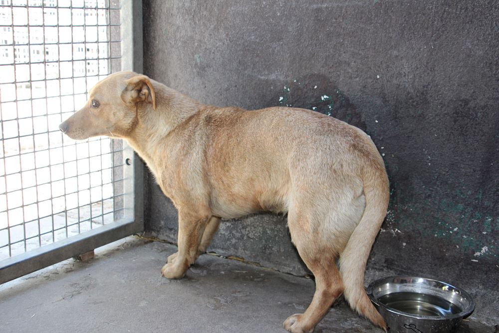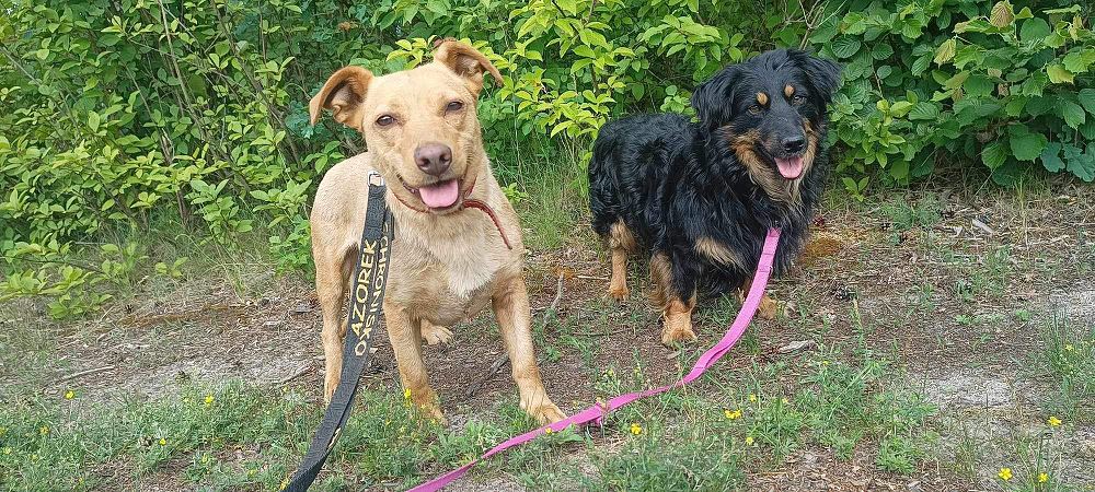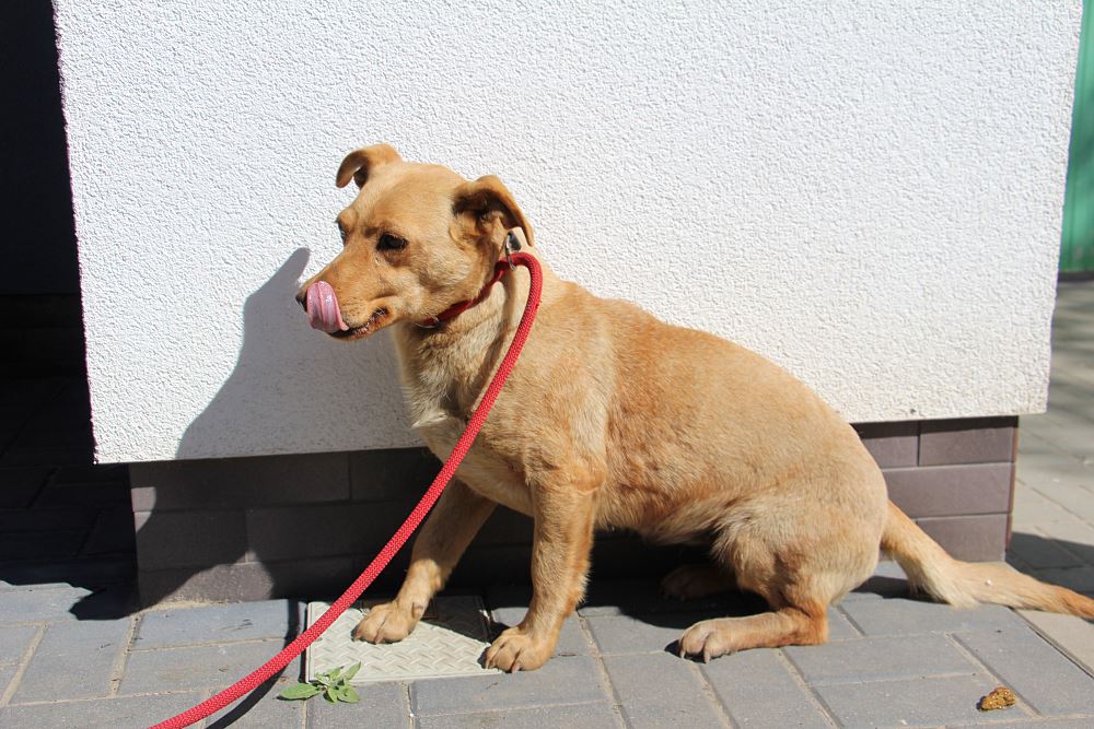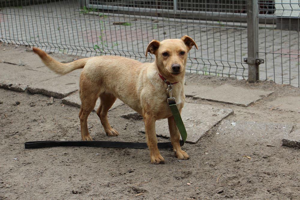 Powoli chodzi już na smyczy, pięknie zgadza się z innymi psami- obojętnie jakiej wielkości, super się bawi z psami, ludzi się jeszcze obawia ale nie ma cienia agresji.