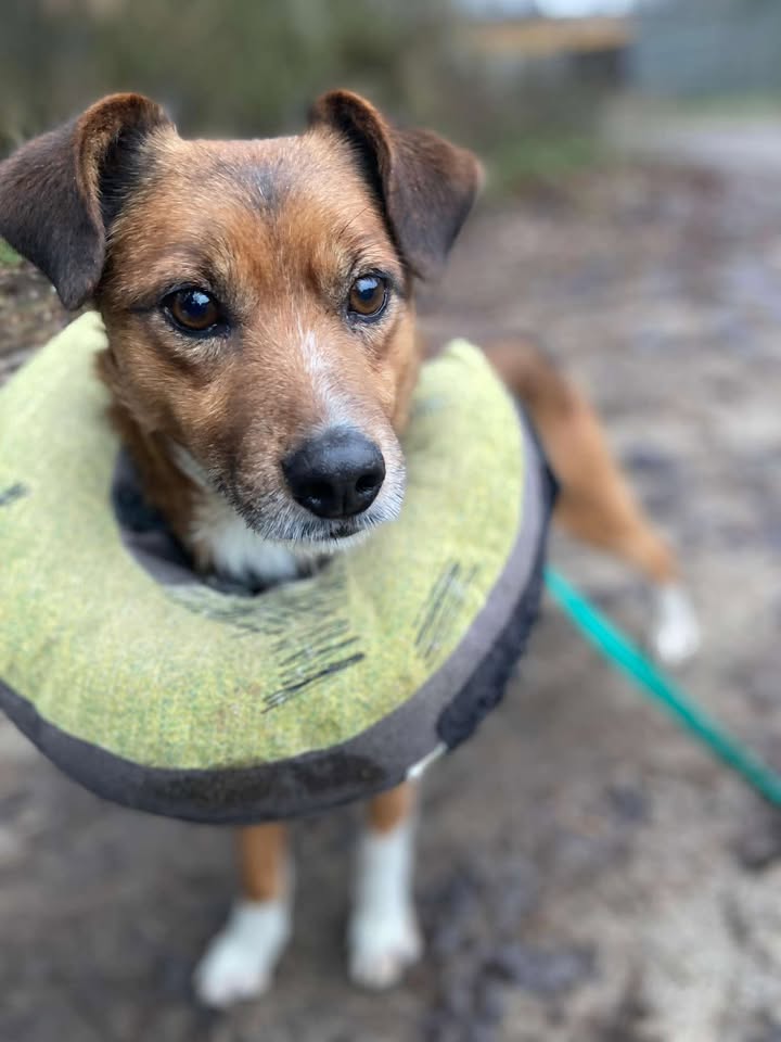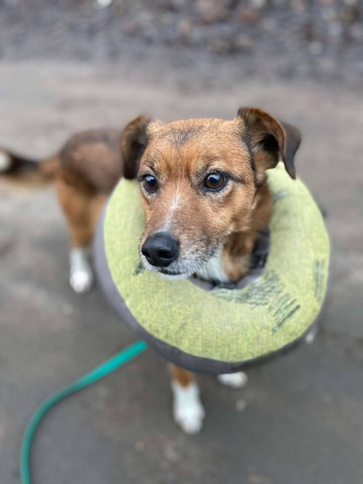 NACZOS Pies przywieziony 20 grudnia 2024 r. z gminy Kamieniec. Przyjechał z dużą raną pod pachą, dlatego od razu był operowany. Naczos ma ok. 10 lat, waży 13 kg. Dzielnie znosi zabiegi wokół rany. Jest miły dla opiekunów.